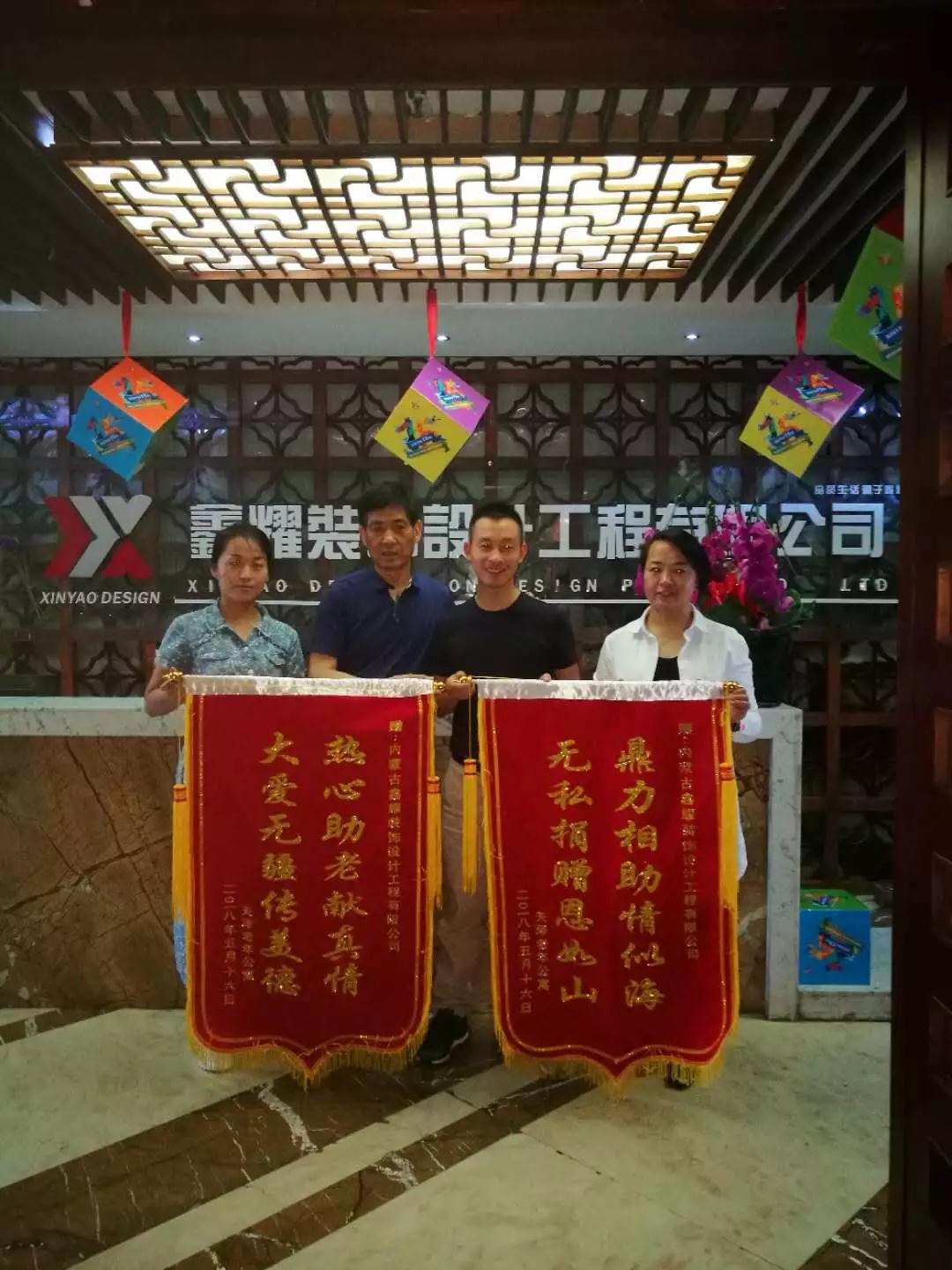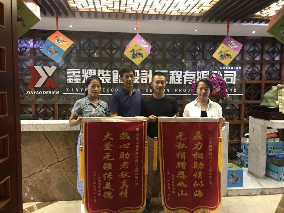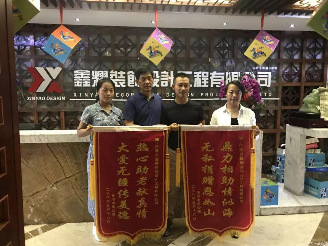 贈送鐫刻了“大愛無疆傳美德,熱心助老獻真情”、無私捐贈恩如山、鼎力相助情似海”等字樣的錦旗。也就是我們鑫耀裝飾在4月9日在天澤老年公寓進行的"關愛老人、奉獻愛心”的活動。