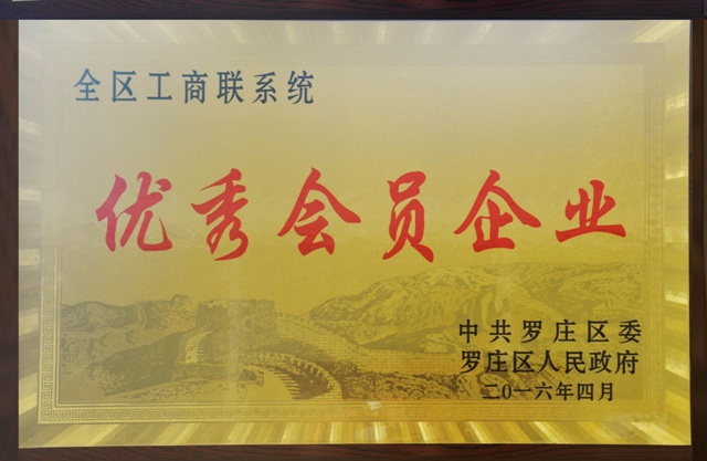 我公司榮獲羅莊區(qū)工商聯(lián)系統(tǒng)“優(yōu)秀會員企業(yè)”榮譽稱號(2016/4/9)