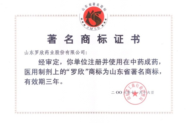 在2006年度的山東省著名商標評選中,山東羅欣的“羅欣”商標被山東省工商局評為“山東省著名商標”,這個殊榮使“羅欣”品牌身價倍增,意味著“羅欣”品牌在今后發(fā)展中將更加受到工商部門的悉心保護和消費者的青睞。