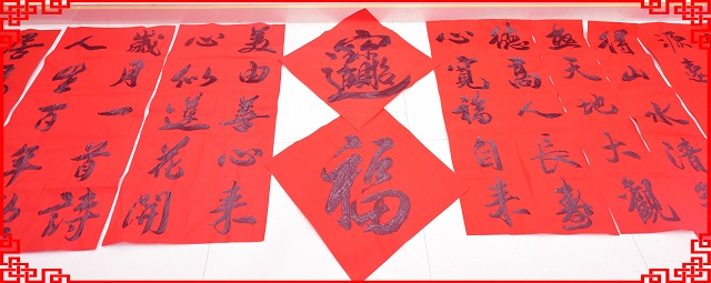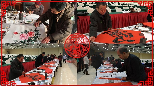 活動(dòng)現(xiàn)場(chǎng),書(shū)法家們調(diào)墨弄筆, 鸞翔鳳翥。他們的作品有的行云流水;有的遒美健秀;有的委婉含蓄;有的酣暢瀟灑;嫻熟的書(shū)法技藝,讓在場(chǎng)的公司員工們不禁贊嘆,同時(shí)也被他們認(rèn)真、執(zhí)著的精神所感動(dòng)。他們?nèi)硇牡耐度氲阶髌分?,一直到下午兩點(diǎn)才休息,共創(chuàng)作春聯(lián)1500余副,中國(guó)畫(huà)20余幅。一副副帶有新年祝福的大紅春聯(lián),把羅欣會(huì)堂渲染的格外喜慶。