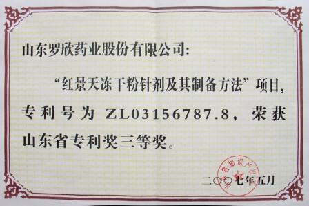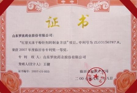 山東羅欣藥業(yè)股份有限公司“紅景天凍干粉針劑及其制備方法”項(xiàng)目,榮獲2007年度臨沂市專利獎(jiǎng)一等獎(jiǎng),山東省專利獎(jiǎng)三等獎(jiǎng)。