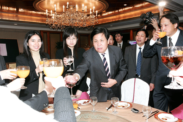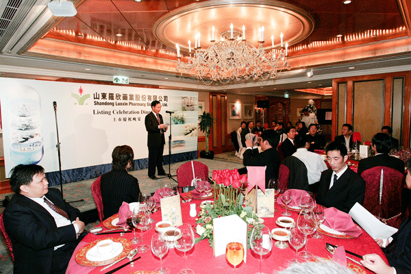 臨沂市副市長、羅莊區(qū)區(qū)委書記李峰在慶功會上共同舉杯祝賀羅欣藥業(yè)的成功上市