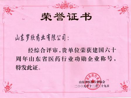 2009年12月,山東羅欣藥業(yè)股份有限公司被山東省醫(yī)藥行業(yè)協(xié)會(huì)評(píng)為建國(guó)六十周年山東省醫(yī)藥行業(yè)“功勛企業(yè)”。