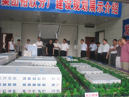 上圖為出席羅莊區(qū)半年工作集中觀摩會的領(lǐng)導(dǎo)參觀集團裕欣分廠建設(shè)規(guī)劃沙盤模型時的情景