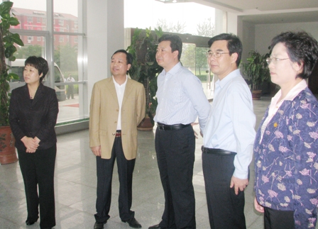 上圖為省委常委、宣傳部長李群(右三)、市委書記、市人大常委會主任連承敏(右二)、 市委常委、宣傳部長丁鳳云(右一)、區(qū)委副書記、區(qū)長劉淑秀(左一)一行參觀公司展廳時的情景